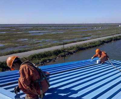 清除彩鋼房頂表面垃圾,然后用打磨機為房頂的接縫處和表面去除鐵屑和殘渣,并在螺帽的位置做防水層處理。